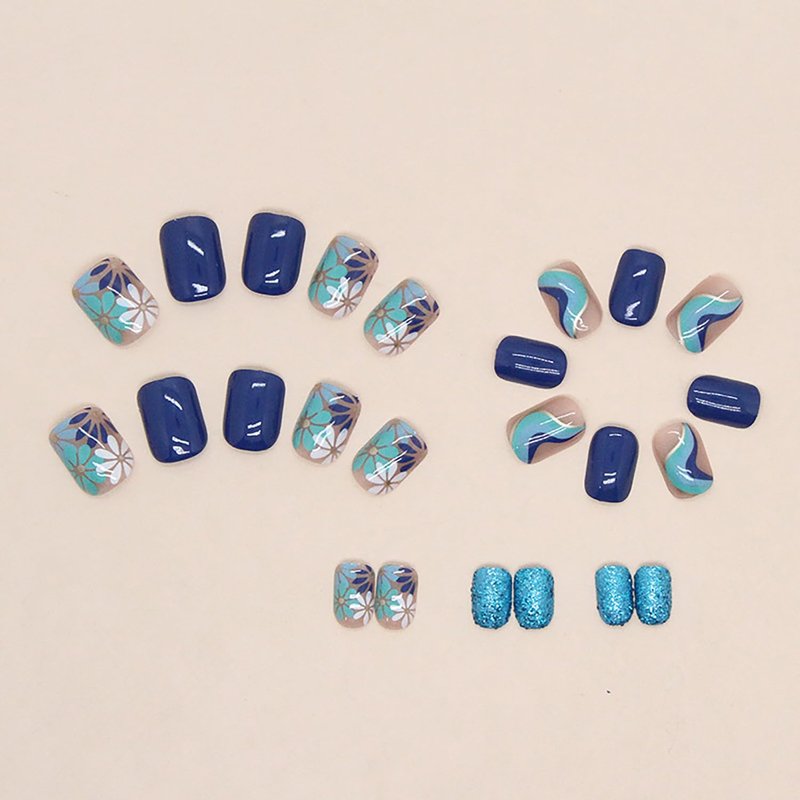 Press on Nails Short Square Fake Nails Acrylic Blue False Nails with Flower Stripe Designs Artificial Glitter Nails Full Cover Glue on Nails Stick on Nails for Women 24Pcs