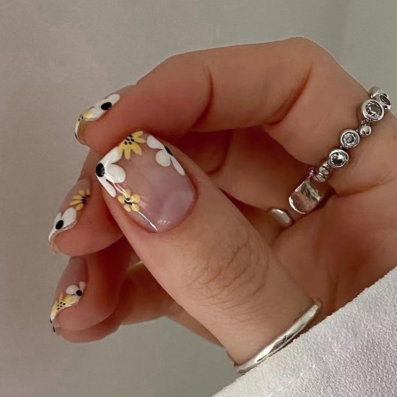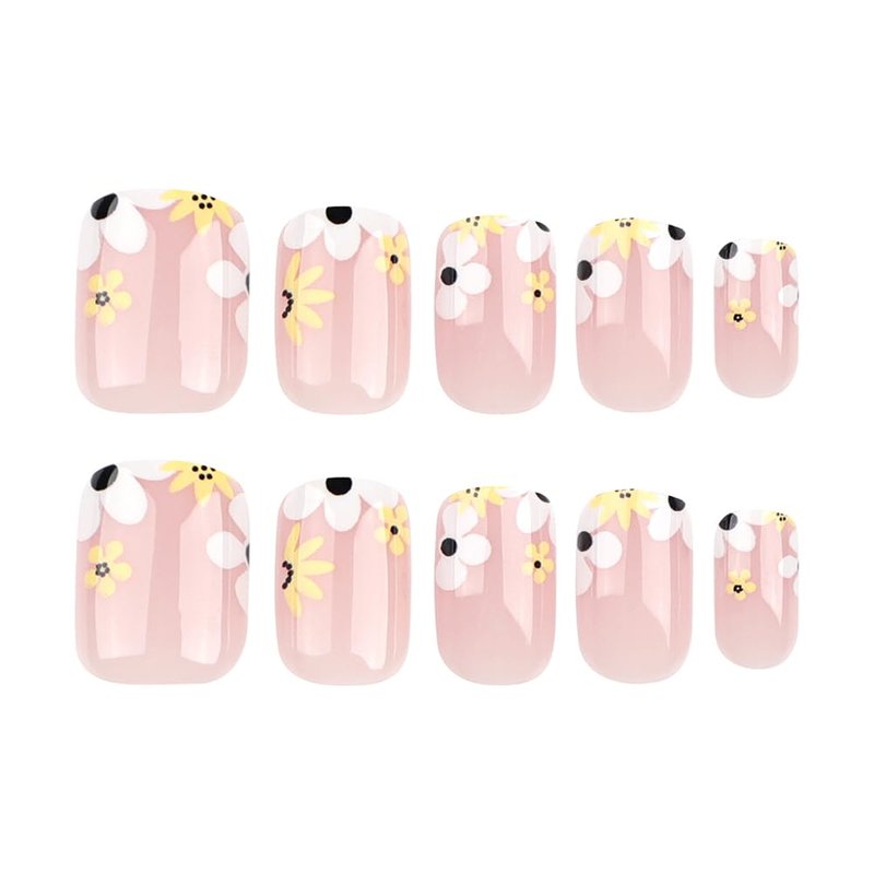 Press on Nails Short Square Fake Nails Glossy False Nails with French Tip Flowers Press ons Designs Acrylic Nails Press on Artificial Nails Stick on Nails For Women Girls 24Pcs