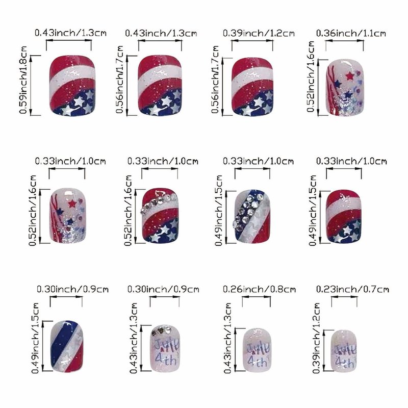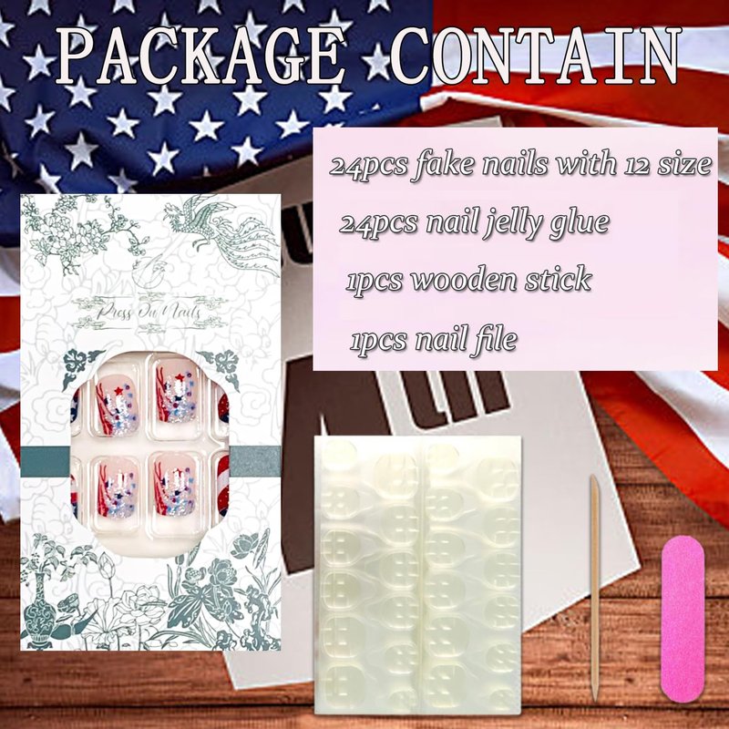 - 【Includes Tool Kit】You'll get 24 Independence Day false nails in 12 sizes. 1 mini nail file, 1 small wooden stick, 1 piece of nail glue sticker. Independence Day glue on nails are perfect for most people's nails.