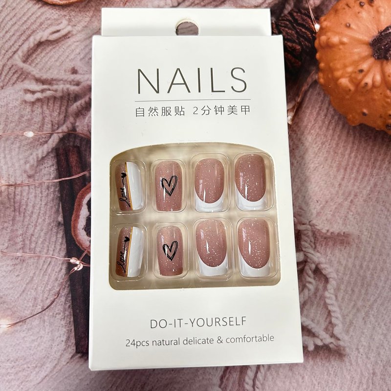24Pcs Press on Nails Short with Love Heart Design French Acrylic Nails for Women Daily Manicure Decorations.