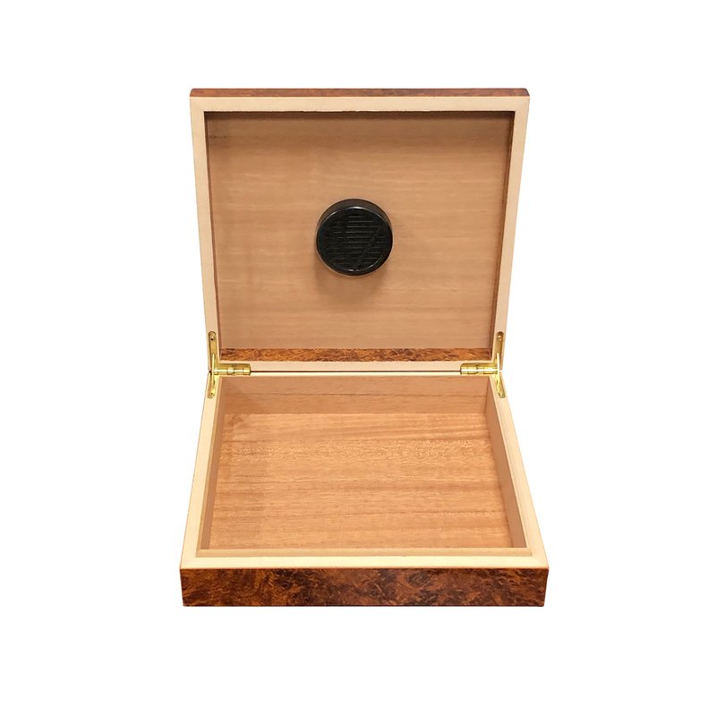 This Burl cedar lined travel humidor will maintain the freshness & taste of your favorite cigars on the go. The Chateau's compact design allows you to easily store it away when traveling. Designed to maintain the perfect 70%-80% humidity. The interior has a removable humidifier that can be filled with distilled water so you can be sure your cigars are kept in exactly the right environment. Holds up to 20 cigars.