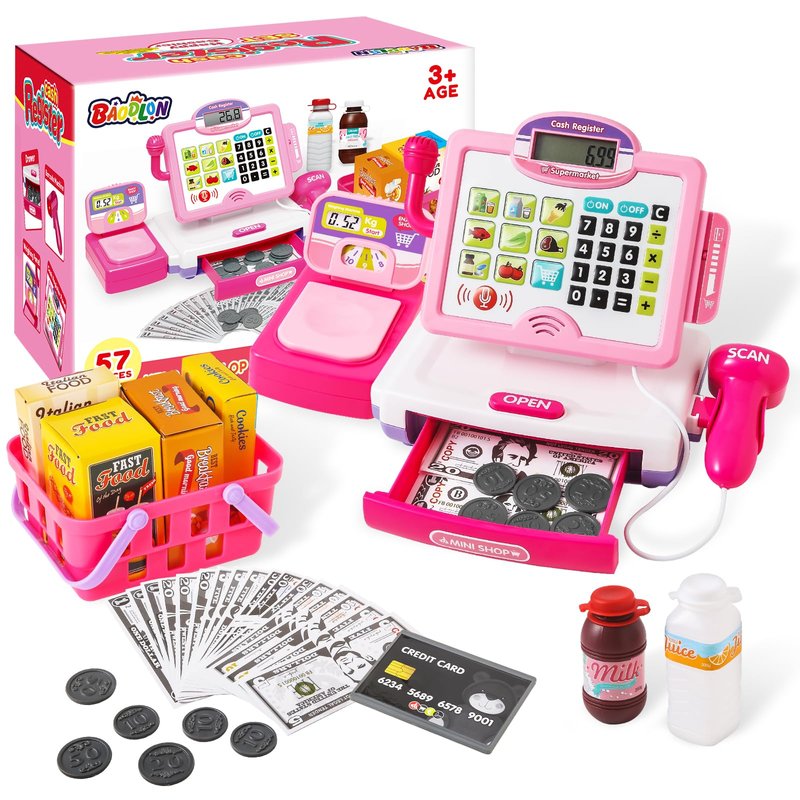 - 57 Pcs to Build a Funny Grocery Store- This grocery pretend play store game set includes a pink cash register with a microphone and sound effects. When you swipe the toy credit card or press the button, you will get funny sounds and lighting. Comes with a pink electronic scale, banknotes and coins of different denominations, a credit card, some play food, drinks, and a pretend food basket. Kids could enjoy a happy pretend supermarket trip. (requires 2 AA batteries, not included)