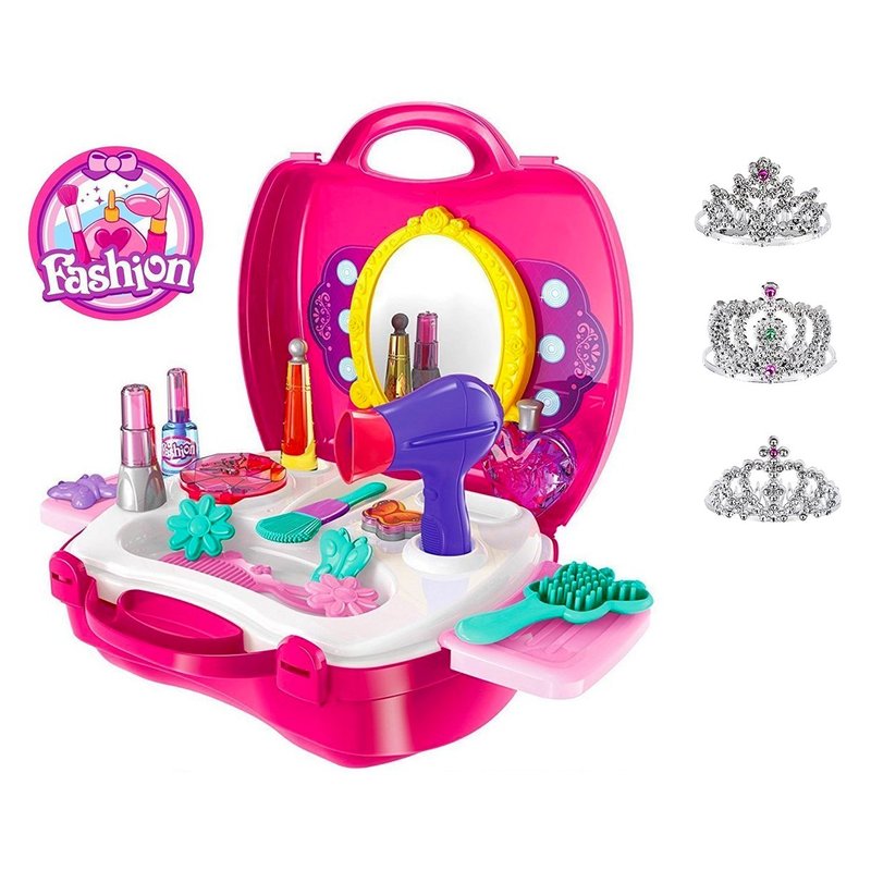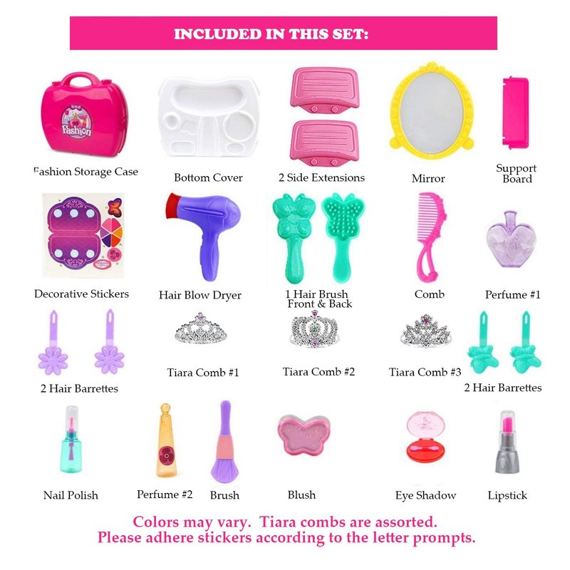 - 👸 SAFETY TESTED AND APPROVED - Suitable for ages 3 and up, this kid makeup kit for girls is made of high-quality and non-toxic materials. Additionally, it is easily washable. This little girl makeup set includes a child-safe mirror, hair blow dryer, hairbrush, comb, perfume bottle, hair barrettes, nail polish bottle, make believe lipstick, eyeshadow and blush. Everything fits into a fashion carrying travel case for taking all the fun with you and the 3 sparkling tiaras as a BONUS!