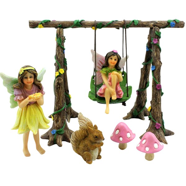 - Fairy Garden Accessories: The fairy garden kit includes 2 fairy garden fairys, a fairy swing set, a squirrel, and 2 pink mushrooms. These outdoor fairy garden supplies will add lovely color to a miniature autumn fairy garden.
