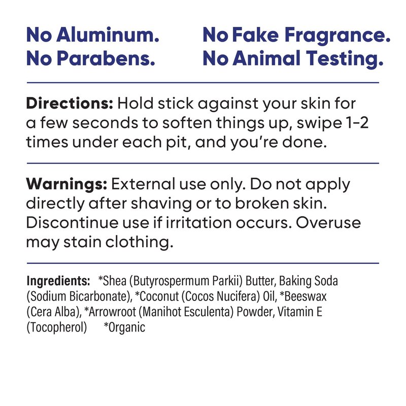 Our natural deodorants work because of what's in them: odor-fighting powerhouses found in nature. Our baking soda formula knocks out odor by neutralizing the root cause. Arrowroot powder helps you stay dry while letting your body breathe and release toxins. A blend of moisture-rich organic coconut oil and shea butter pampers your pits with nourishing goodness. It's a win-win when it comes to the battle against stink.
