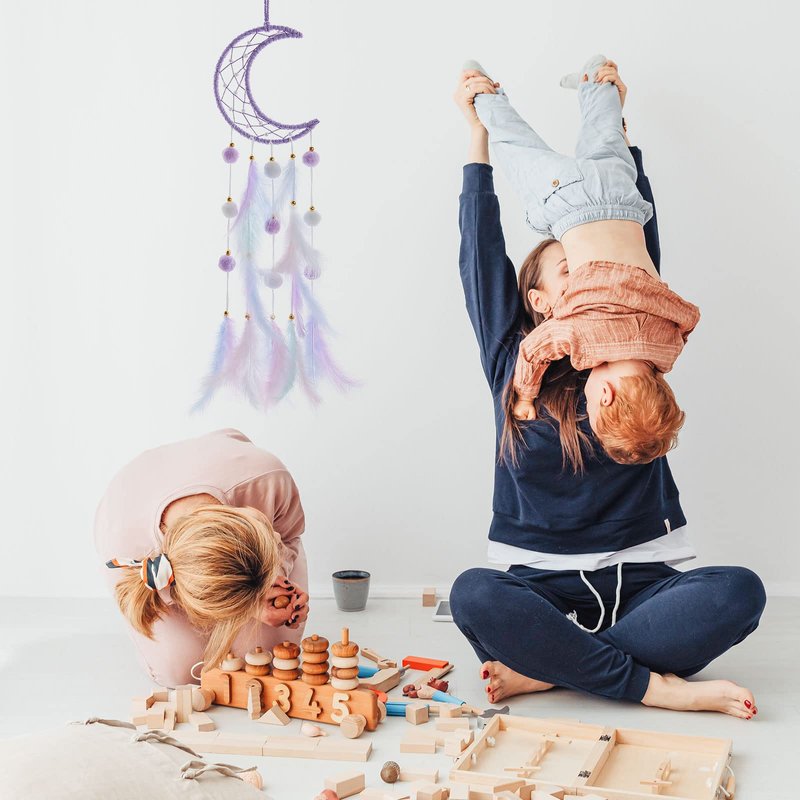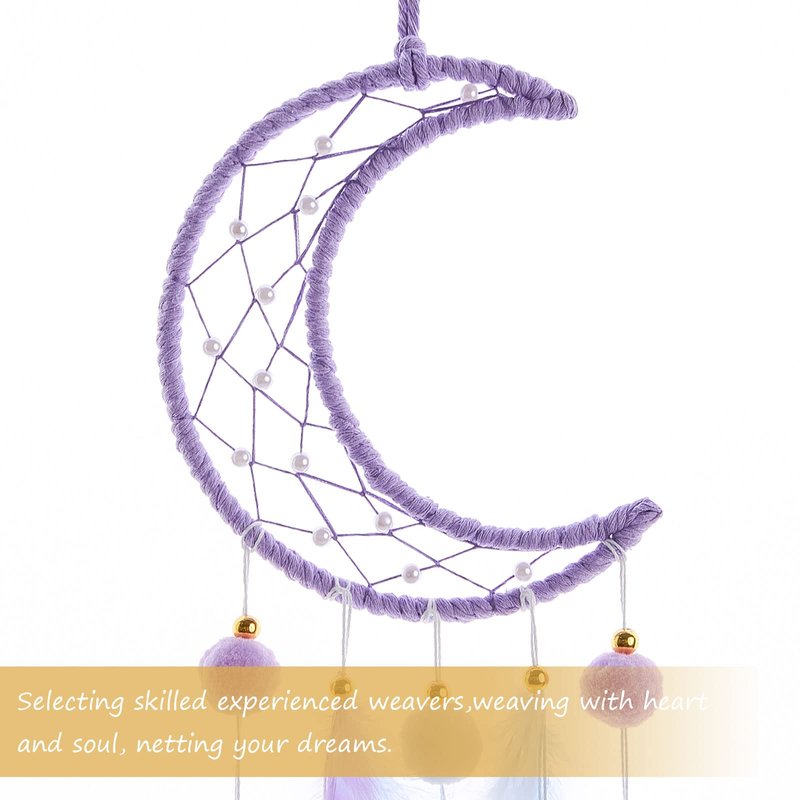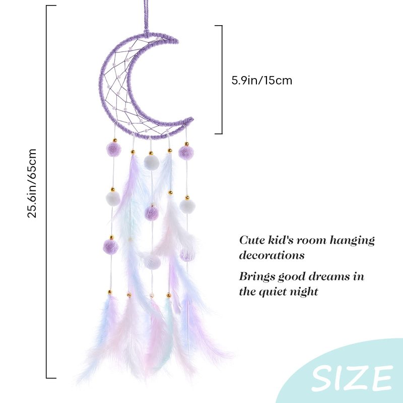 - 💗【Natural Material】:The hanging purple moon kids dream catcher is made of the fumigation feather,pom pom balls and thread handmade crochet net.Fully assembled.No DIY Required