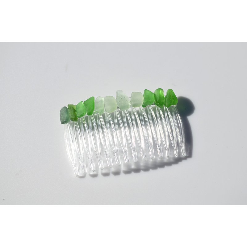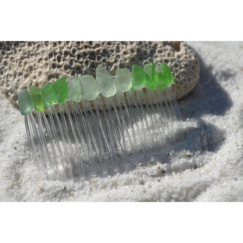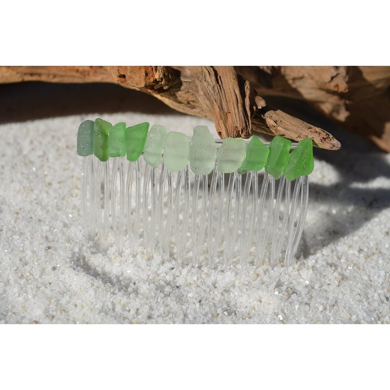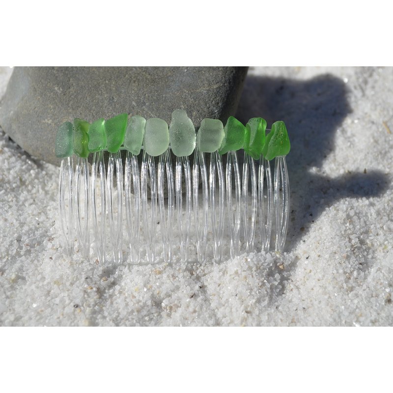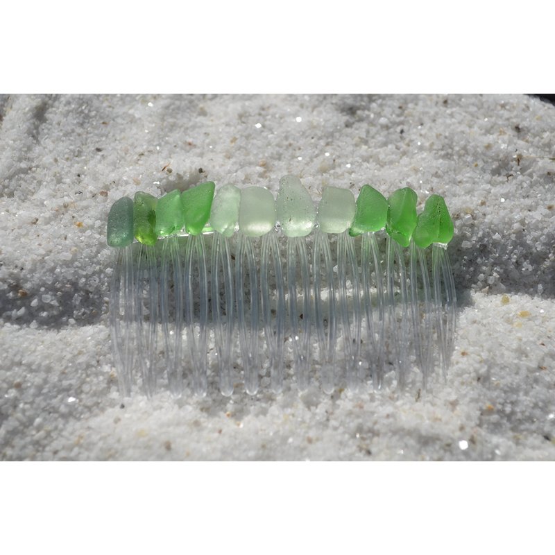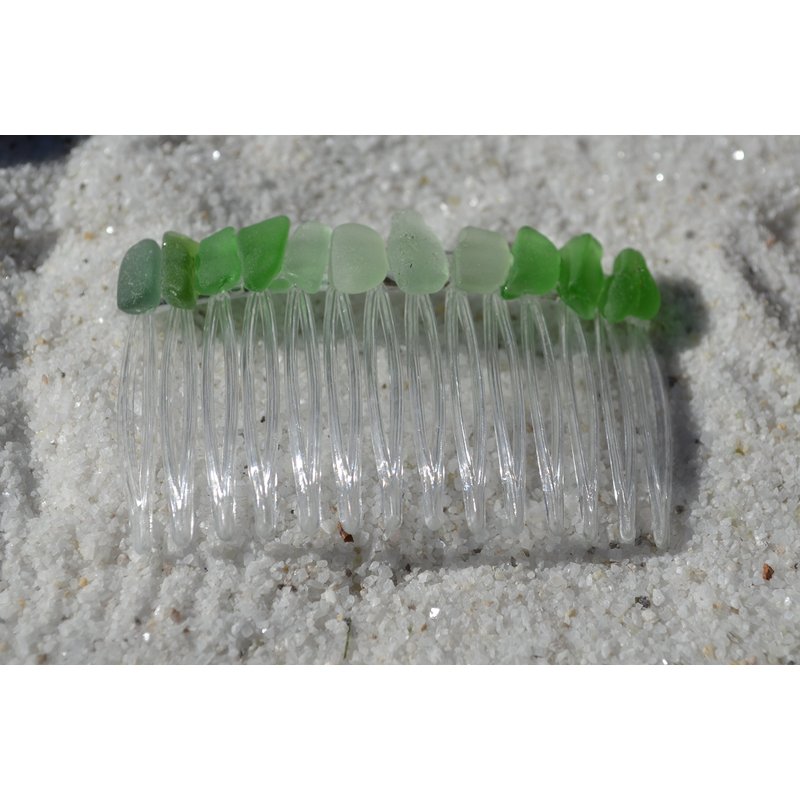 Pretty green, sea foam, and frosted white sea glass hair comb. The colorful frosted beach glass adorns an acrylic hair comb. The hair comb is perfect for a beach wedding or just frolicking in the surf while enjoying a day at the beach. The hair comb is handmade. Each piece of sea glass was carefully selected for its unique and compelling ocean shades, combined they create a lovely hair comb. The sea glass is genuine and was collected on the rocky shores and sandy beaches of Coastal Maine. The sea glass has a lovely natural frosted surface as a result of the glass being tossed about the ocean waves and sandy shores for years. The hair comb is made in the USA and comes from a smoke free environment. The hair combs measure: 67 mm x 41 mm or 2.65 inches x 1.6 inches