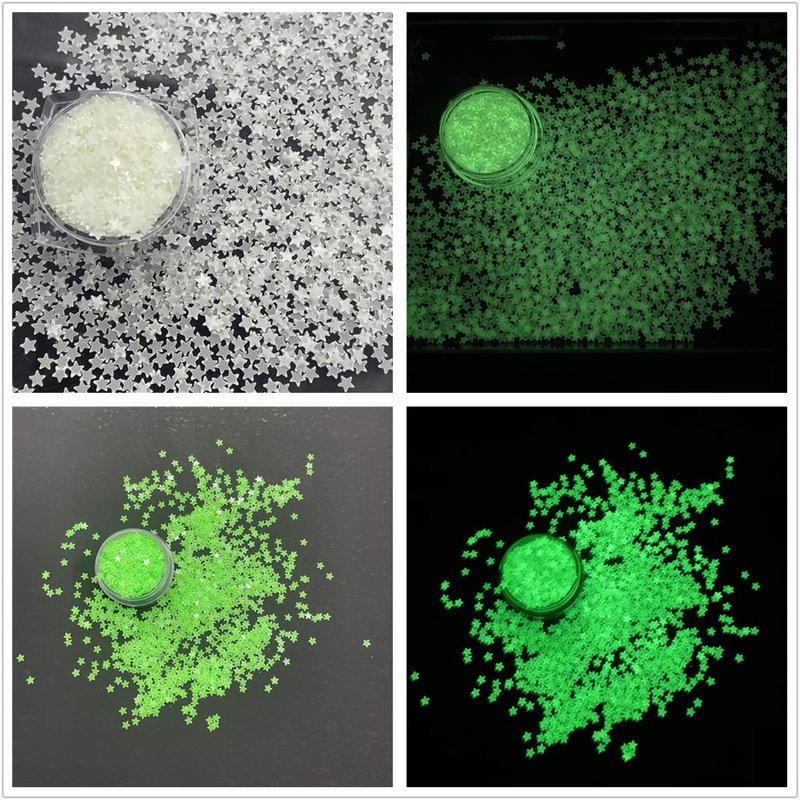 - [Luminous Nail Art Glitter Glow in the Dark] Our nail art glitter package includes 5 boxes nail sequins including stars shape sequins.Gift one box shape glitter.Luminous series all need to absorb light (sunlight/light) before it lights up in the dark