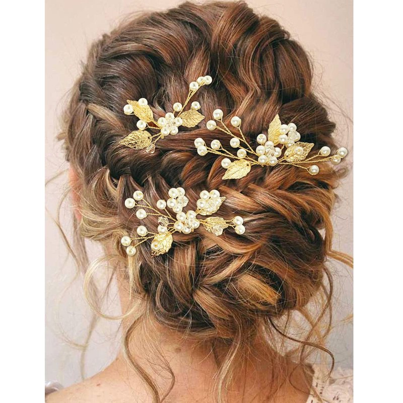 PRETTYLIFE Pearl Wedding Hair Pins U-Shaped Gold Leaf Hair Accessories Head Pieces for Bride Women Girls Party, Set of 3