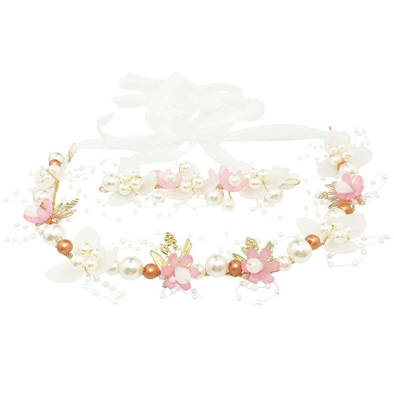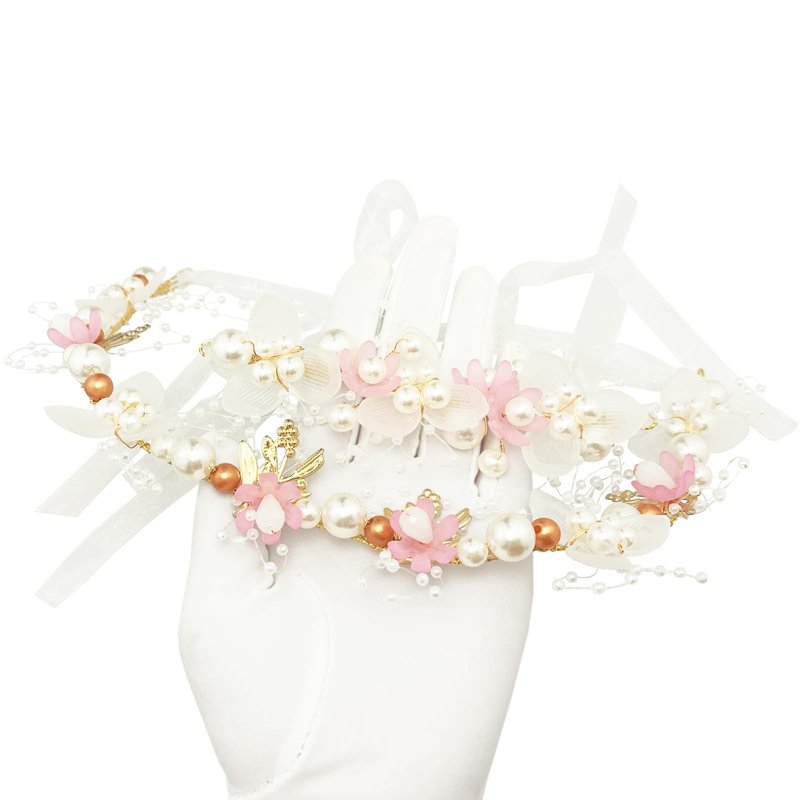 PrettyLife Pearls Flower Headpiece with Matching Wrist Corsage Set for Wedding Flower Girl Fairy Hair Piece Accessories for Birthday Party (Pink Style)