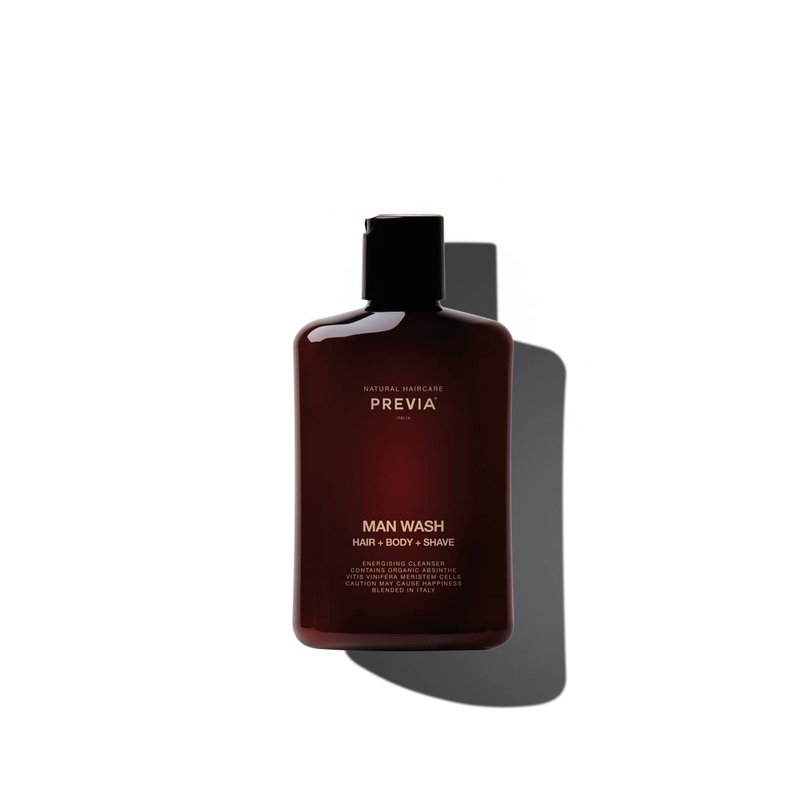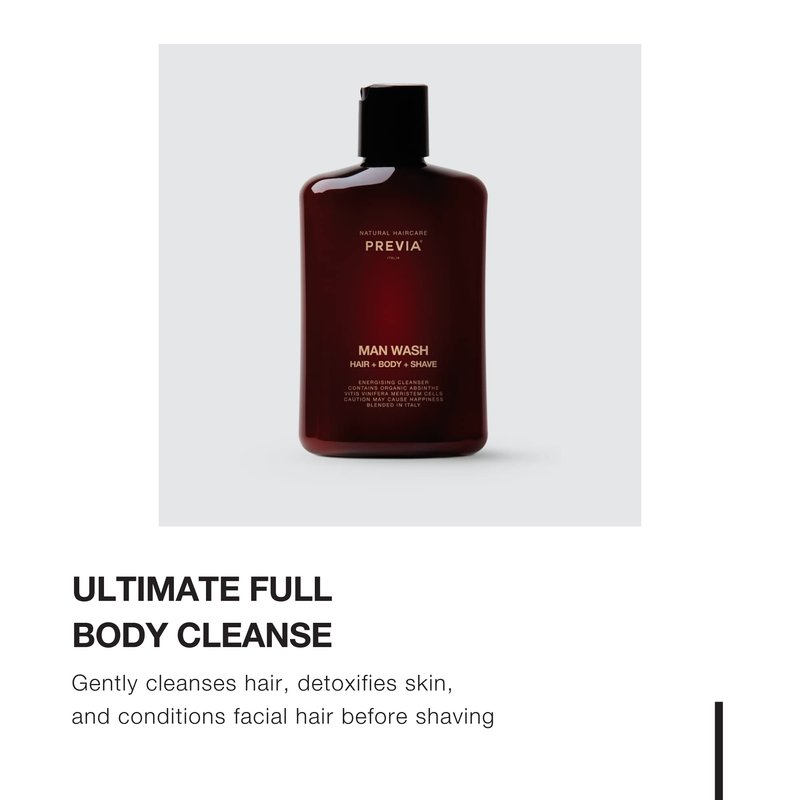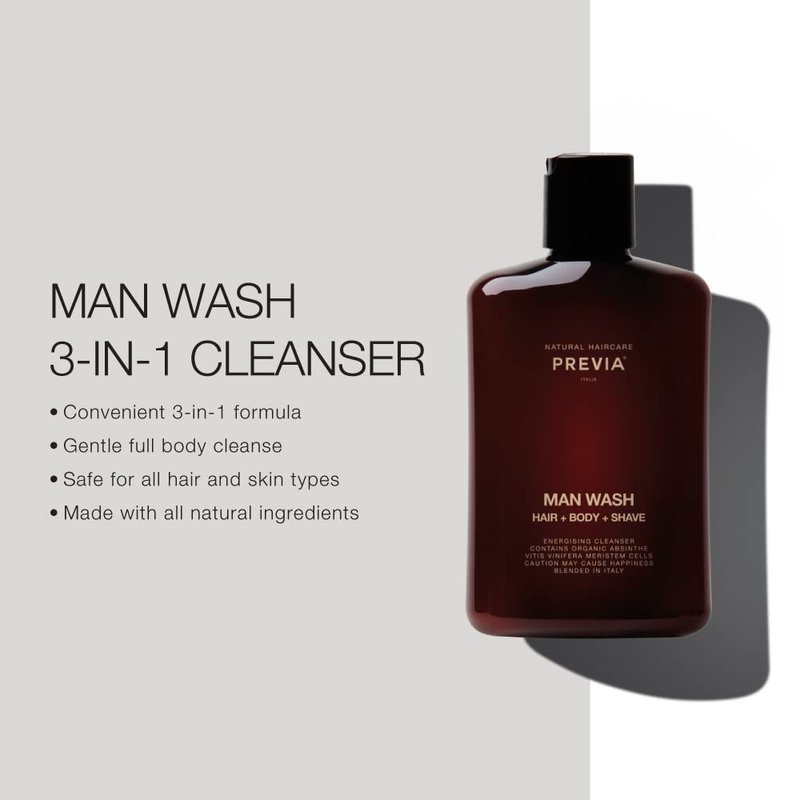 PREVIA Man Wash 3-in-1 Cleanser - Hair Shampoo, Body Wash, and Shaving Conditioner (8.45 oz)