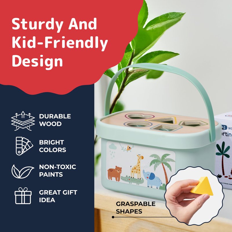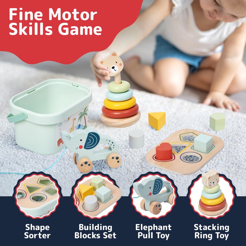 - SPARK IMAGINATION: Ignite your toddler's creativity with this montessori box, a stacking montessori toy set that includes a shape sorting box play kit (9Lx6.4Wx5 Inch), stacking rings with a bear, and a rolling elephant