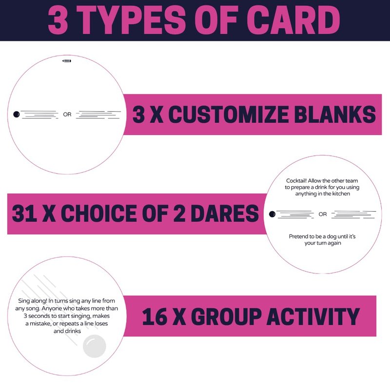 - ✨78 DARES: Combine classic beer pong with 78 hilarious dares from card games and activities + 3 blanks for you to customize with your own dares and games.