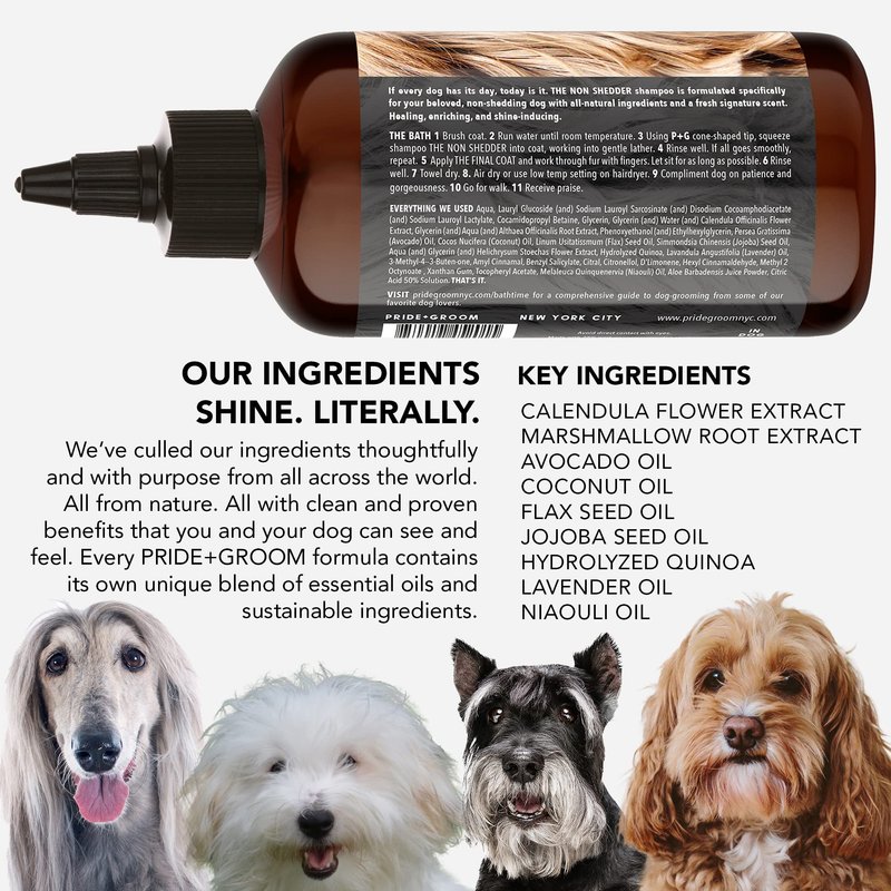Every PRIDE+GROOM formula contains its own unique blend of all-natural essential oils, unique signature scents, and sustainable ingredients chosen for dogs' specific coat and skin types. These coat-specific, oil-rich formulas of unmatched consistency provide healing, hydrating, cleansing, nourishing and beautifying benefits. They also offer dogs the level of luxury coat and skin care that, up until now, only we ourselves could enjoy.Not only are our formulas luxurious, but the delivery mechanism for our bottles is designed to replicate the most advanced human hair care bottles. The twist-controlled cap (only available for our 16 oz bottles) with cone-shaped tip allows for an easy one-handed wash while controlling the flow and ensuring the formula penetrates deep into the coat and skin.Avocado Oil – Hydrates fur and hair, soothes and nourishes skin, relieves itchiness, and relieves dryness (EWG Score: 1).Calendula Extract – Skin conditioning agent, heals skin irritations, soothes dry and itchy skin, and hydrates fur and hair (EWG Score: 1)Coconut Oil – Minimizes doggy odor, creates sleek/glossy coat, promotes wound healing, and reduces allergic reactions (EWG Score: 1).Flax Seed Oil – Supports healthy coat and hair, enhances luster to coat and hair, and nature’s riches source of omega-3 fatty acids (EWG Score: 1).Jojoba Seed Oil – Unclogs hair follicle, heals hot spots, leaves fur as soft as a young pup, and contains skin-healing properties (EWG Score: 1).Marshmallow Root – Moisturizes dry, itchy pads, speeds healing of hot spots, safe in case your dog licks (EWG Score: 1).Niaouli Oil – Soothes itchy skin, heals dry skin, and makes dogs unattractive to insects and other nasty microorganisms (EWG Score: 1).Vitamin E – Direct nutrient for skin and fur, shines fur, soothes skin, and restores health and luster to coat (EWG Score: 1).