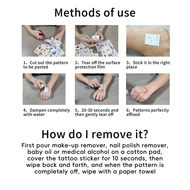 - γππ¨π° ππ¨ ππ¬πγFirstly, keep the skin dry and clean. Cut off the sticker to be applied, peel off the protective film, apply it to the skin, press with a damp cotton for 30 seconds, peel off the paper, and let the tattoo dry
