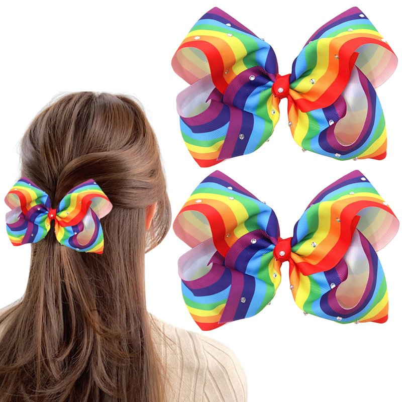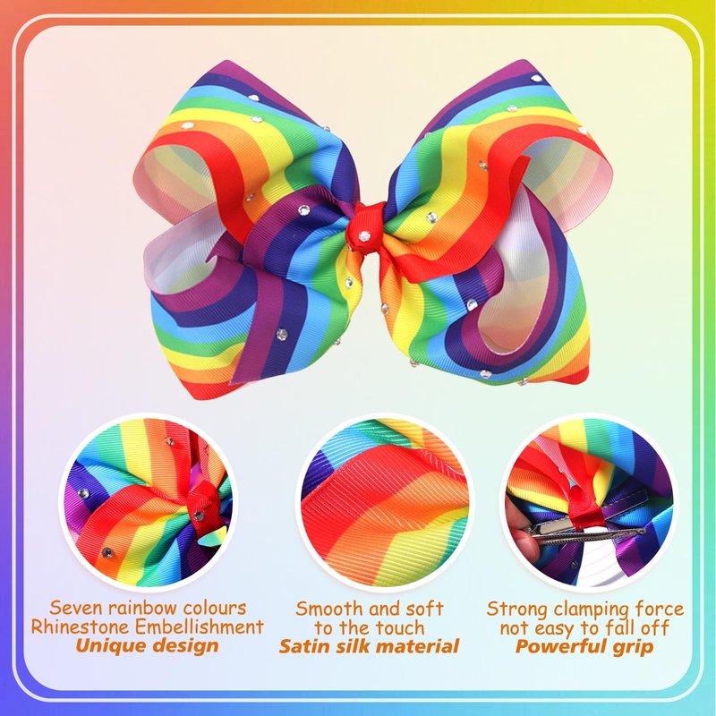 - ๐๐ฑ๐ช๐ฎ๐ข๐ฌ๐ข๐ญ๐ ๐๐๐ฌ๐ข๐ ๐ง :The rainbow hair bow clip features rhinestones and colorful stripes, making it perfect as a hair decoration for Pride Day parties or any other holiday celebration, making you the focus of the party.
