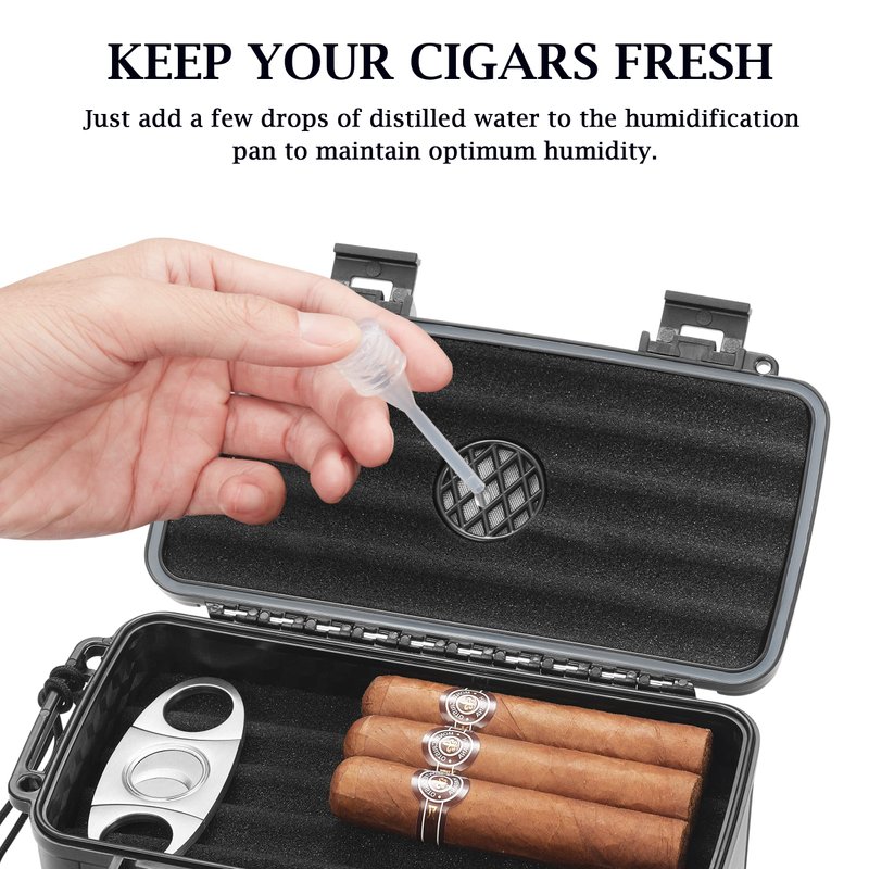 - 【KEEP YOUR CIGAR IN PERFECT CONDITION】: This portable travel humidor is built-in an excellent humidification tray, simply add a few drops of distilled water for keeping your cigars fresh under the ideal humidity in your travel. It is perfect for traveling, golfing, going out drinking, camping, fishing, or boating, etc