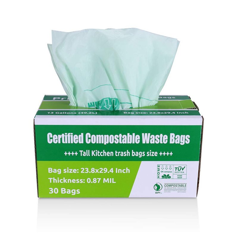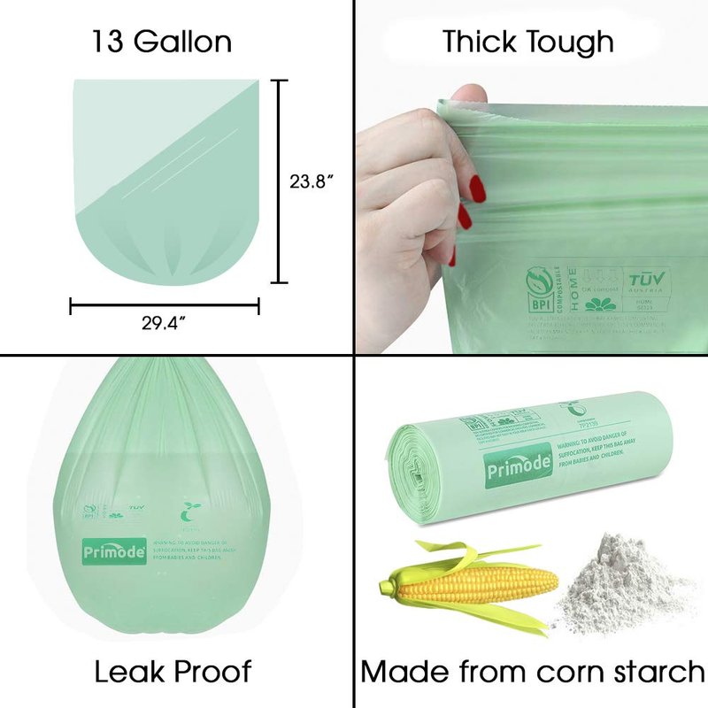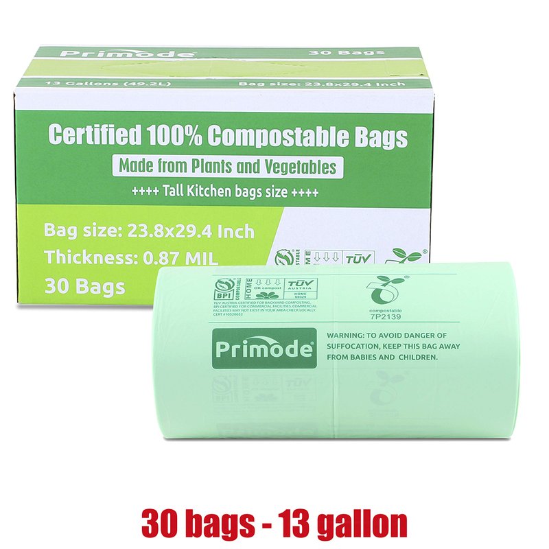 Primode 100% Compostable Trash Bags 13 Gallon | 30 Count Tall Kitchen Compost Bags, Food Waste Bags, Certified Compost Bags, Certified by BPI and TUV, Extra Thick 0.87
