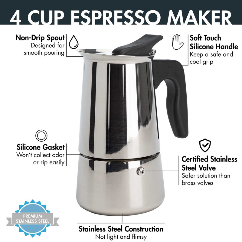 - BETTER BREWING - Primula’s Premium Stainless Steel Espresso Coffee Maker is compact, easy to use and delivers 4 demitasse/espresso servings of fresh, aromatic espresso in one pot. Enjoy smooth, delicious stovetop espresso brewed within minutes from home