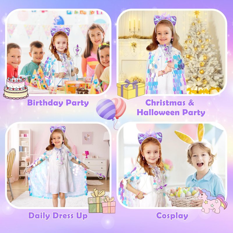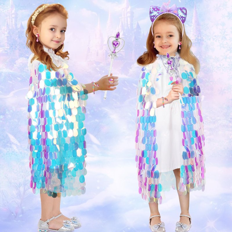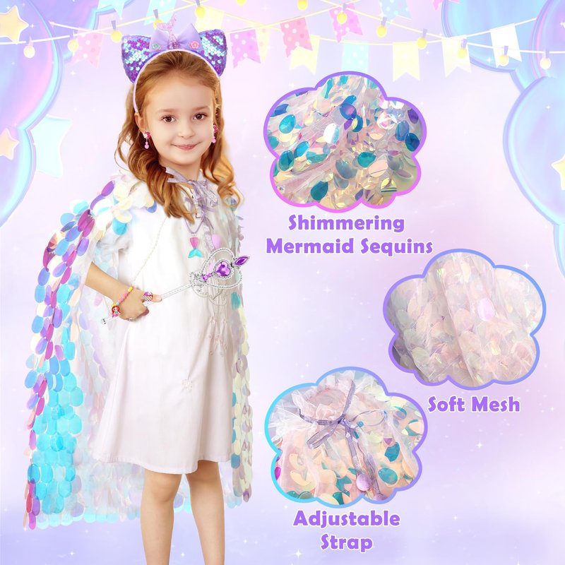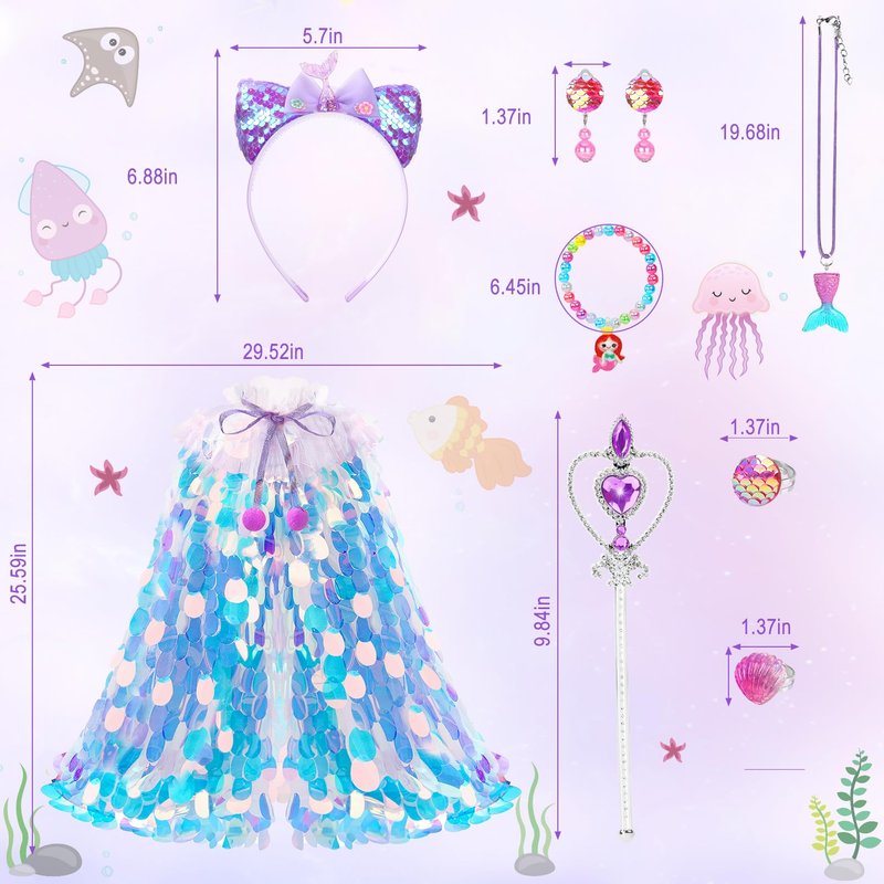 - Mermaid Toddler Dress Up Cape Set: Princess dress up clothes for girls 4-6 designed for all little princess girls includes 1* glitter princess cape, 1* sequin headband, 1* necklace, 1* bracelet, 2*rings, 1 * earrings and 1* wand. All little girls' dreams of becoming a beautiful princess will be satisfied by the overall mermaid design of toddler toys 3-8. Cute toys for 3 4 5 6 7 8 year old girls will be the gifts and toys that every girl looks forward to.