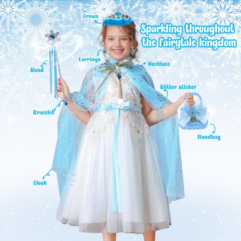 - 【Magical Princess Dress Up Costume Cape Set】 If your girl loves dress-up games, our princess costumes for girls will meet their imagination and curiosity. Our girls' dress-up clothes come with everything needed to be a princess! Our princess toys for 3-year-old girls include a snow princess cape, princess crown tiaras, necklaces, and essential princess wands. These are must-have princess dress-up toys for girls aged 3-6 and are perfect for every little girl in kids' dress-up and pretend play
