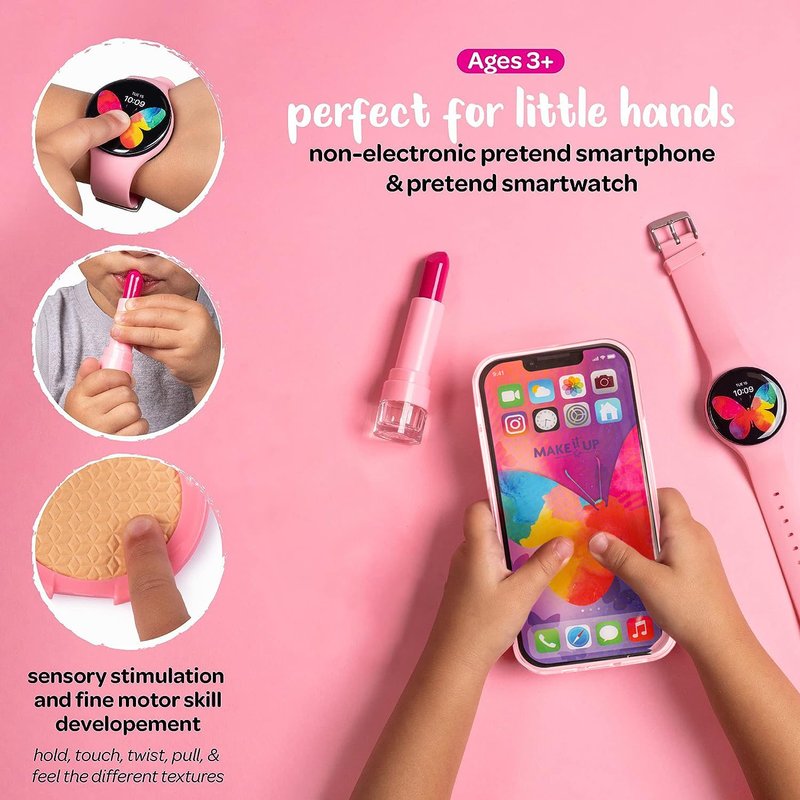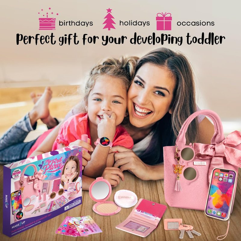 - 👜 MY FIRST PURSE SET : Our package includes pretend play kids purse & toddler girl toys pretend makeup kit for girls contain 15 pieces. kids purse, non-electronic smartphone & smartwatch, wallet with fake money, pretend key fob with keys, blush compact with applicator sponge, pretend lipstick, 2 credit cards, 1 library card, 1 ice cream gift card & 1 vip spa card. This kids makeup kit has a variety of kids toddler pretend play toys for endless hours of fun realistic money baby boy toys.