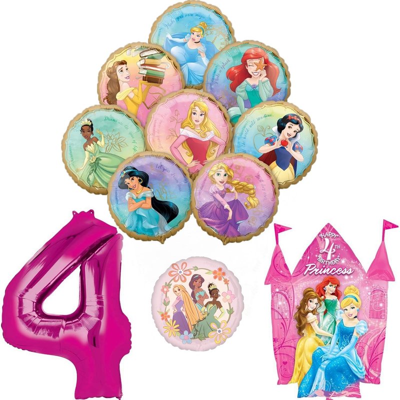 - (1) 34" Giant Pink Number 4 Foil Balloon, (1) 35" Happy 4th Birthday Princess Castle Foil Balloon, (8) 18" Princess Foil Balloons Ariel, Belle, Cinderella, Jasmine, Rapunzel, Sleeping Beauty, Snow White and Tiana, (1) 18" Princess Group Foil Balloon featuring Rapunzel, Tiana and Jasmine. Inflate balloons same day of event. Ribbon Not Included. All Anagram Licensed Foil Balloons are Made in USA. Founded in 1977, Anagram International leads the world in innovating and manufacturing foil balloons.