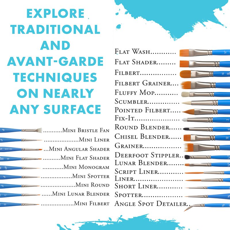 - THE MOST COMPLETE ASSORTMENT - Select Artiste brushes are offered in 29 distinct shapes and 108 individual styles, including flats, shaders, rounds, fan, daggers, filberts, washes, liners and more.