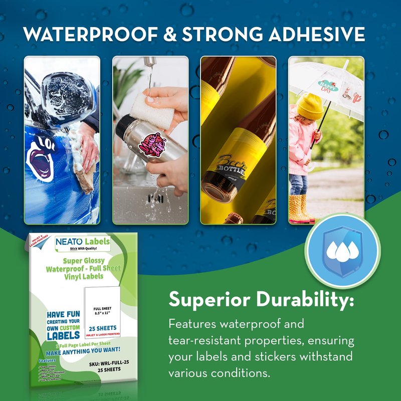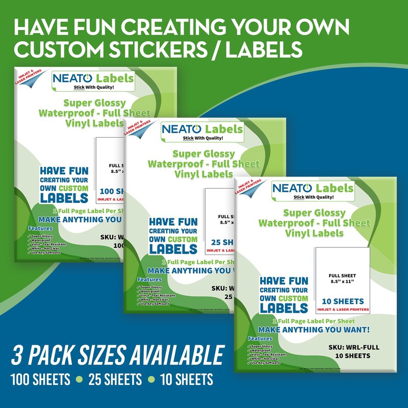 - Durability: Our sheet labels are waterproof and tear-resistant, ensuring your stickers and labels last longer. Order your premium glossy vinyl labels 100 Percent Risk Free. Neato Labels backs our product with a 100 percent money back guarantee.