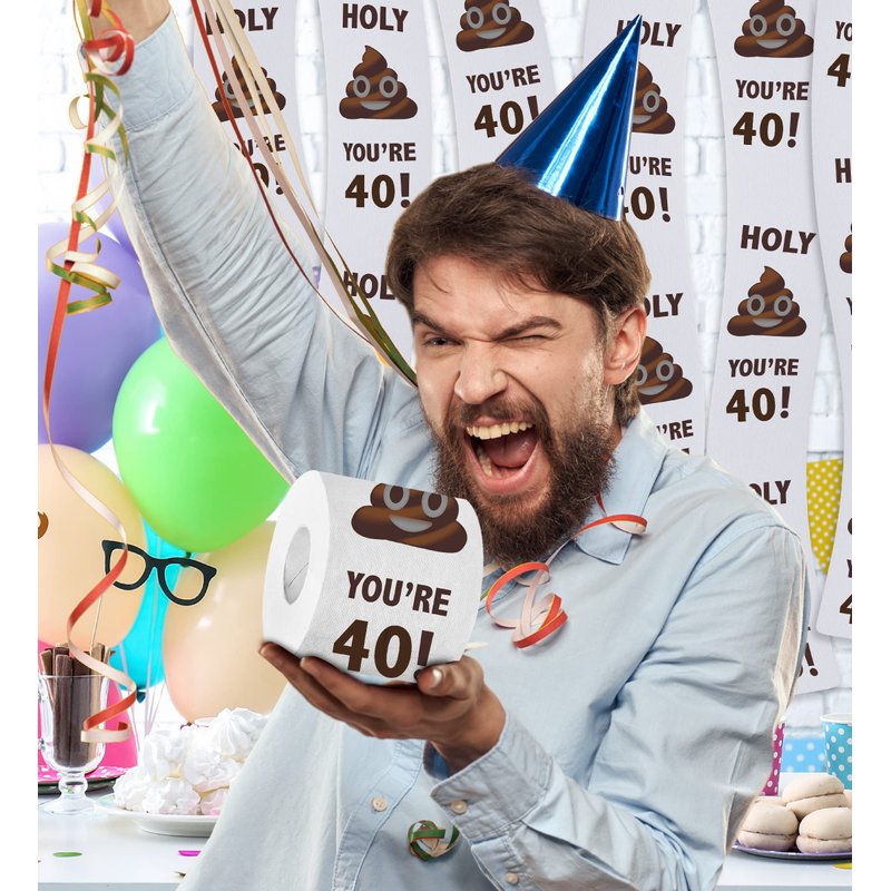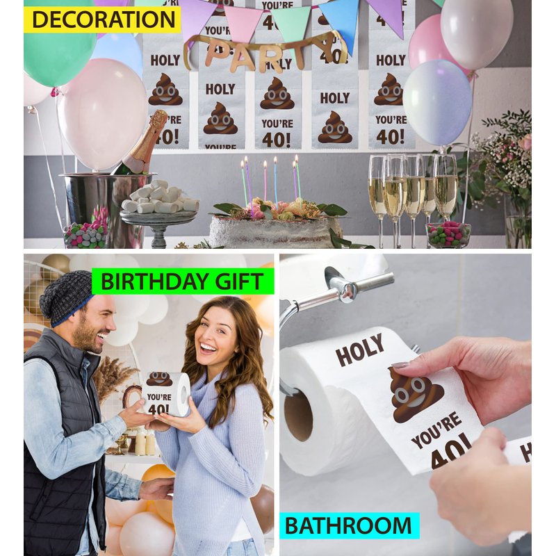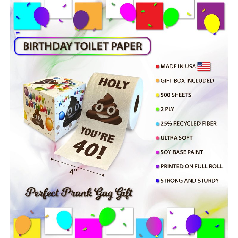 - INCLUDED WITH THE PURCHASE OF BIRTHDAY TOILET PAPER ROLL - Includes 1 Full Size 2 Ply 500 sheets 40th Birthday Printed Toilet Paper with a birthday box. The gag toilet paper features a funny birthday greeting "Holy You're 40!" with a poop design. Each sheet is a reminder that humor never gets old. Celebrate any birthday with a lot of fun with this cute toilet paper as your party favors, joke gift giveaways, or for your toilet paper prank games.