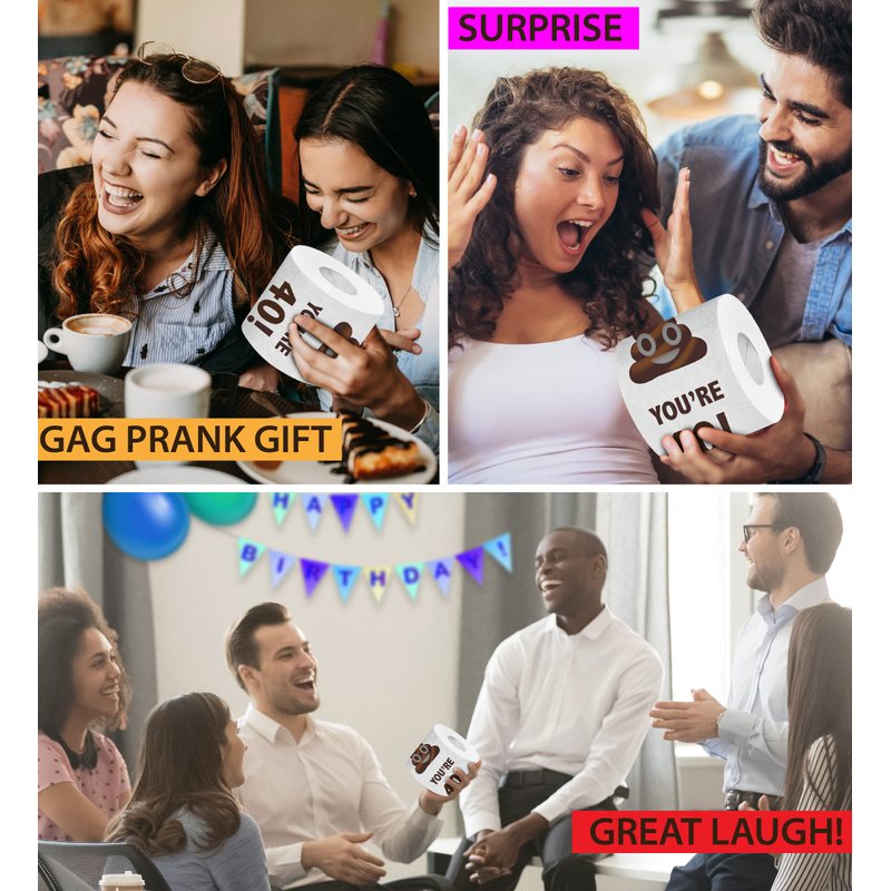- IDEAL USE FOR THE BIRTHDAY GAG GIFTS HILARIOUS TOILET PAPER ROLL - Celebrate yours or theirs 40th birthday in a hilarious way by using the funny novelty gifts toilet paper. Make everyone laugh with your silly gifts for adults with a funny birthday poop message. No need to gift wrap the birthday toilet paper funny gag gift, with its funny gift box, this custom printed toilet paper will be your birthday's ready-to-present prank gift box surprise.