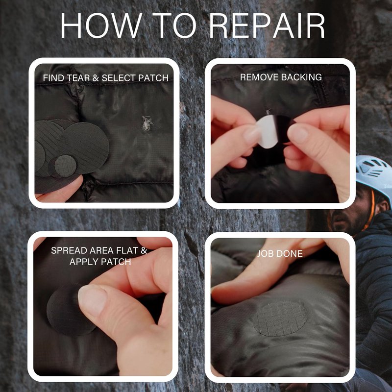- INSTANT FIX WITH DOWN PATCH KIT: Get your nylon jacket looking like new in just 30 seconds with our Down Jacket Repair Kit. Whether it's a rip in a puffy coat or a snag on a down coat, our nylon repair patches self-adhesive design ensures a long-lasting solution. Choose from black nylon patch, blue patch, or the especially sought-after navy patches for jackets.