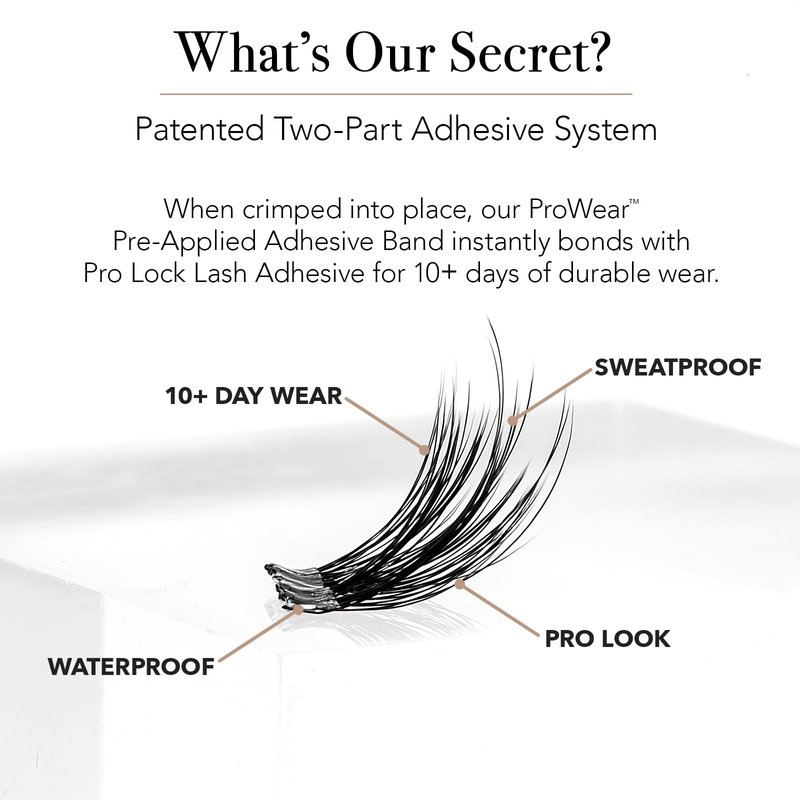 - Industry-Leading 10+ Day Wear – ProWear cluster eyelash extensions are built to last—up to 10 days of wear or more; sweatproof and waterproof, our patented adhesive system starts with our non-sticky ProLock Adhesive (included) that bonds to our pre-applied self adhesive eyelashes when crimped together with tweezers (included)