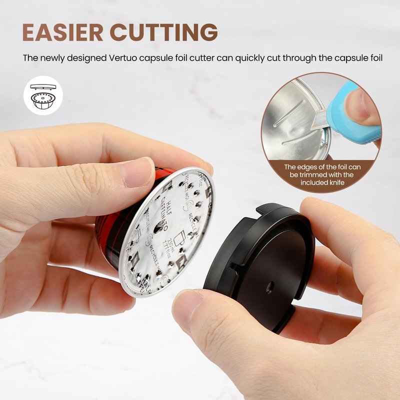 - EASIER CUTTING: The Vertuo capsule refill kit's newly designed foil cutter can quickly cut the Vertuo capsule foil, and the package also comes with a trimming tool for more precise trimming of the capsule edges.