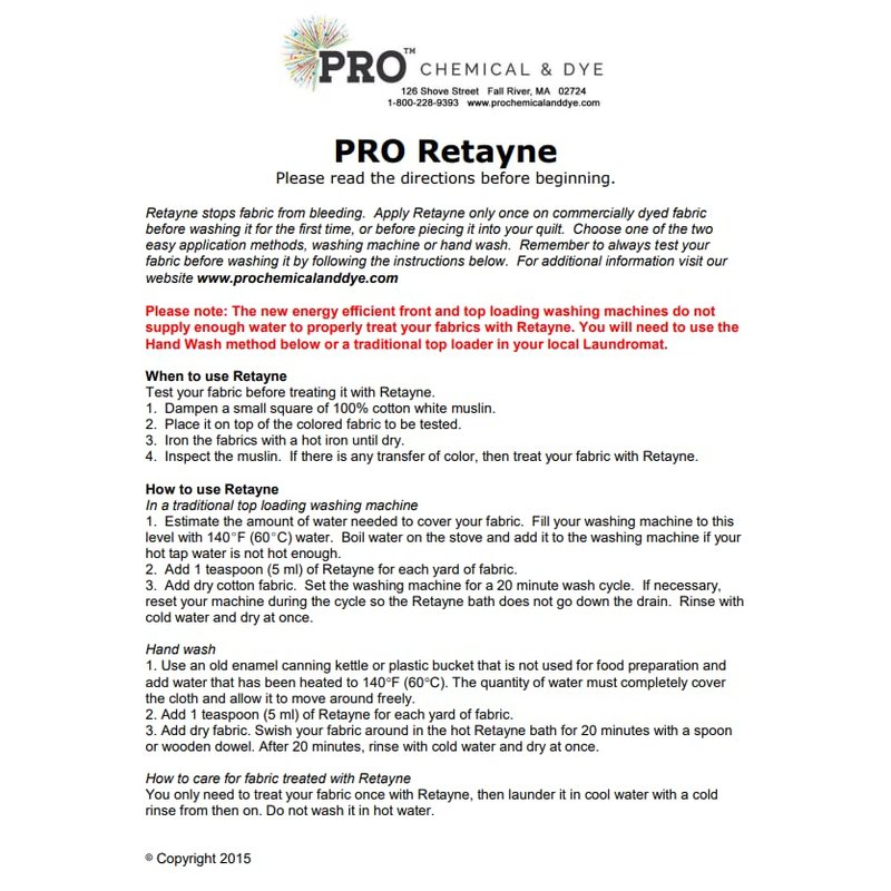 Introducing PRO Retayne Color Fixative 8 oz bottle: the ultimate solution for preserving the vibrant colors of your fabrics and textiles! Whether you're an avid quilter, a passionate crafter, or a fabric enthusiast, this innovative product is designed to enhance and protect the brilliance of your creations. PRO Retayne Color Fixative is a must-have product. It has been specifically formulated to lock in dyes and prevent bleeding, ensuring that your colors remain vivid and true, even after multiple washes. Say goodbye to faded fabrics and hello to long-lasting brilliance! How to apply Retayne. Apply according to manufacturer's instructions. Retayne is used by adding 5 ml (one teaspoonful) to hot water (140°F or 60°C) for each yard of fabric and agitating for twenty minutes, then rinsing in cold water and drying immediately. This 8 ounce bottle PRO Retayne Color Fixative provides you with a generous supply, offering ample opportunities to treat and protect numerous projects. It’s user-friendly design allows for easy application, enabling you to effortlessly treat your textiles with precision. Whether you're working on a delicate quilt, a custom-made garment, or a vibrant wall hanging, this product will become your go-to companion. Not only does the PRO Retayne Color Fixative do a great job in improving washfastness, but it also maintains the softness and texture of your fabrics. Unlike some fixatives that leave a stiff or crunchy residue, this original version has been specially formulated to ensure that your textiles retain their natural feel and drape.