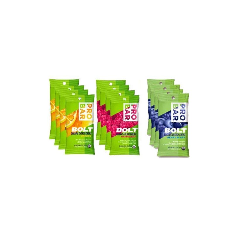 Probar Bolt Organic Energy Chews Set Mixed Berry, Orange and Raspberry - Four of Each Flavor, Box of 12