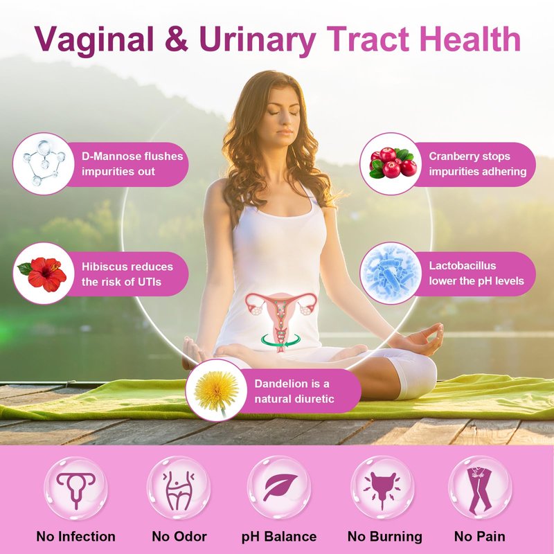 - Maintain Vaginal & Urinary Tract Health: D-mannose sticks impurities and detoxifies, Cranberry stops bad flora adherence, Hibiscus and Dandelion increase flow to flush away, probiotics for pH balance. Fivefold action works fast to relieve burning, itchiness, and odors. A superior formulation restores proper balance and cleanliness in women's intimate area. No sugar, calories, or preservatives that are safe to take daily for boosting wellness.