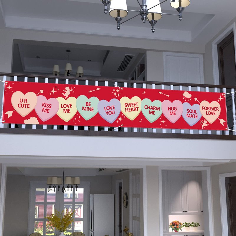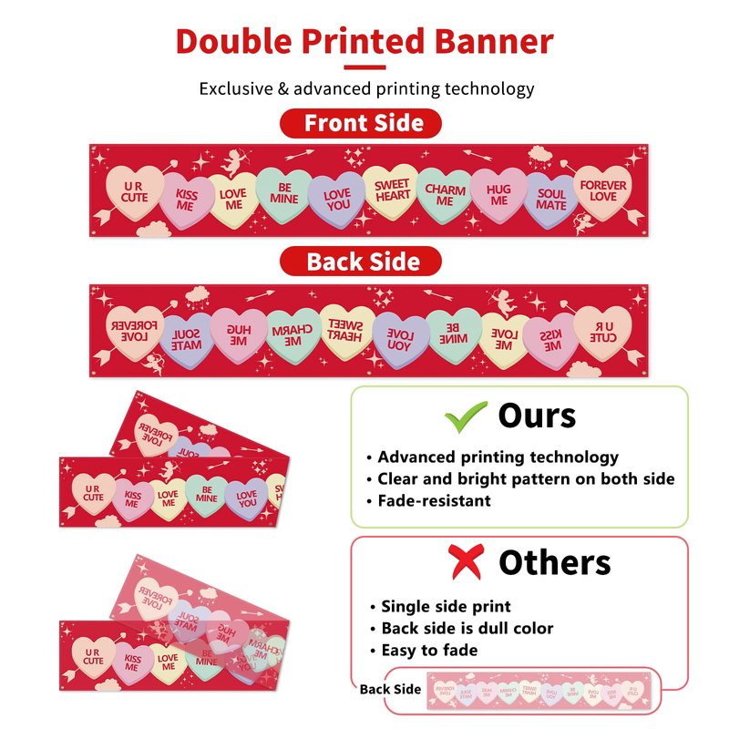 - [Nice & Creative Design]: The valentines day banner has creatively 6 brass grommets, coming with a roll of rope, easy to hang. Using exclusive and advanced double sided printing technology that the banner can be seen brightly and clearly on each side.