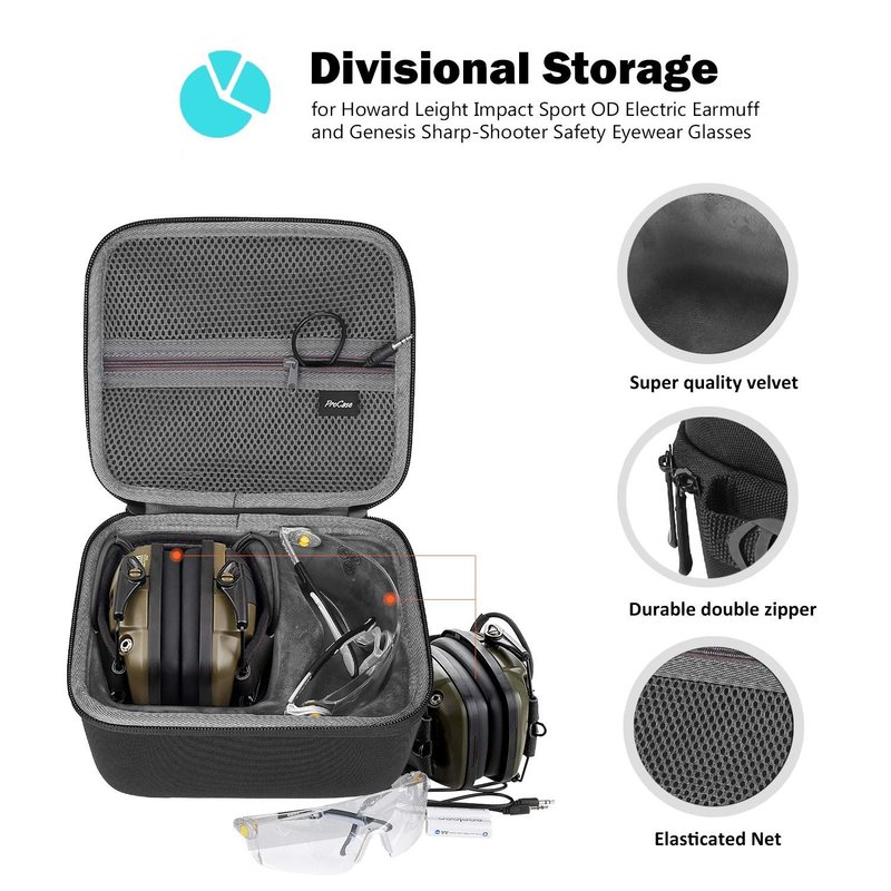 - ✅Hard travel carrying case specially designed for Howard Leight by Honeywell Impact Sport Sound Amplification Electronic Shooting Earmuff and Genesis Sharp-Shooter Safety Eyewear Glasses (Case only, devices and accessories Not included)