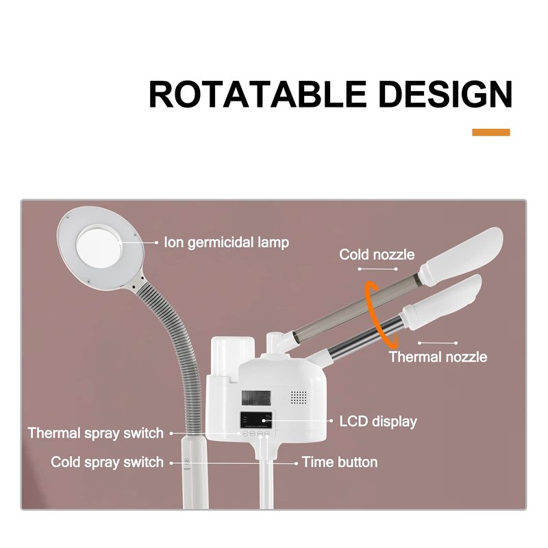 - ROTARY AND MOVEABLE - 360 degree rotary spray pipe allows to moisturize your face; Rolling wheels makes it convenient to move this facial skin care machine around the room. There is an aroma diffuser at the nozzle mouth, you can put the aroma diffuser and use it