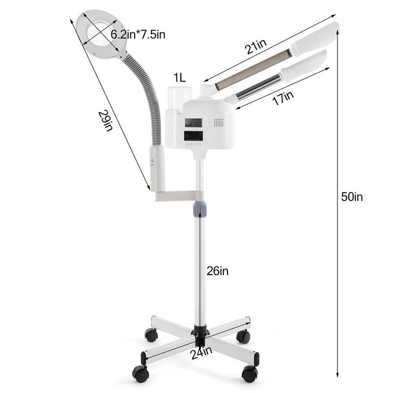 Specification: Material: "Main Part:Brand New PP Material Support Pillar: Iran and Stainless Steel; Water Container: PP Color: White Voltage: 110V Rated Frequency: 60HZ Power: 610-810W Plug: US plug Support Frame Length: 21" Support Pillar Height Range 39"-49" LED lamp length: 15.7" ,360 degree bend Heating Temperature :100°C Water Reservoir capacity :1L Size: 61 * 61 * 127cm Magnifying Lamp: Voltage: 110-220V,50/60HZ; Power: 10W Package content: 1 X 2in1 Spa Ozone Hot&cold Facial Steamer & Magnifying Lamp 1 X Instruction