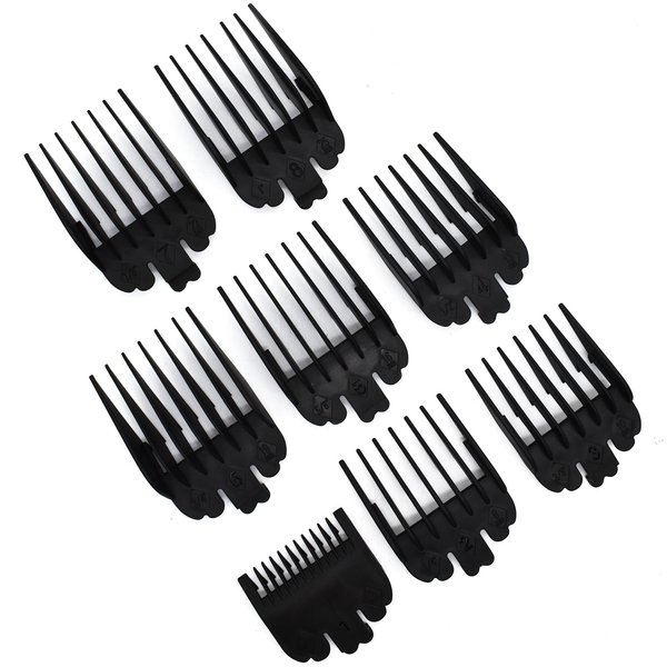 - The package comes with 8 pieces of guard combs ranging from 1/8" to 1" in black and 1 piece of cleaning brush