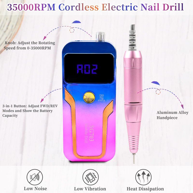 - ➤【Max Speed to 35000RPM】Due to the advanced cordless motor and powerful bearing, the max speed of this new electric nail drill machine can reach 35000RPM, allowing you to do nail shaping, polishing, removing and carving with ease. You can also change the speed by rotating the knob, based on your own need. It's an ideal manicure tool for nail salon and home use.