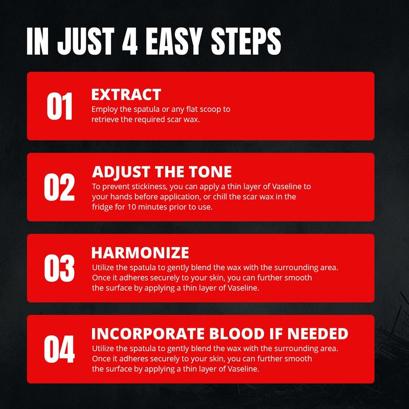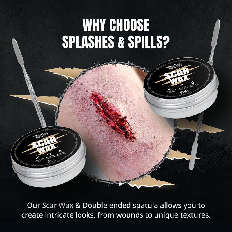 - Realistic Wounds: Create shocking scars and wicked-looking wounds for the stage with Splashes & Spills Scar Wax! Our scar makeup kit is perfect for creating realistic fake wounds and scab blood effects that bring a hellish appeal to your Halloween outfit.
