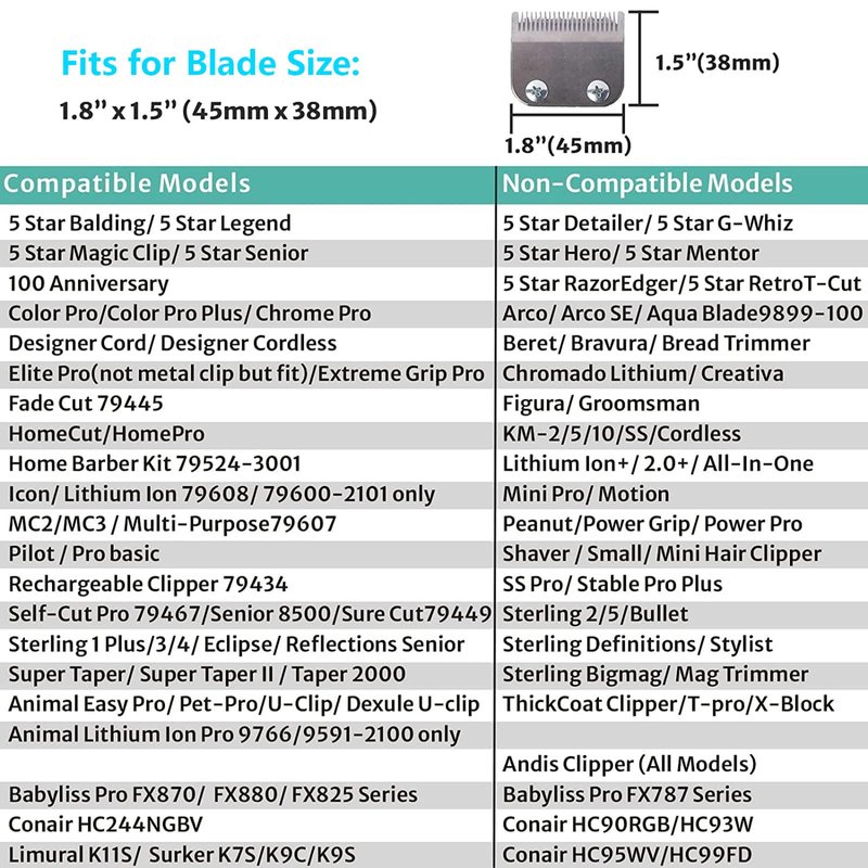 - Fit Wahl Model:5 Star Balding, 5 Star Legend, 5 Star Magic Clip, 5 Star Senior, 100 Anniversary, Color Pro, ColorProPlus, Chrome Pro, Designer, Elite Pro, Extreme Grip Pro, FadeCut, HomeCut, Home Pro, HomeBarber79524-3001, Icon, Lithium Ion79608/79600-2101/9766, MC2/3, Multi-Purpose79607, Pilot, Pro basic, Rechargeable Clipper79434, Self-Cut Pro, Senior, SureCut, Sterling, 1Plus/3/4/Eclipse/Refections Senior, SuperTaper, SuperTaper II, Taper2000, Animal U-Clip, Dexule U-Clip, EasyPro and Pet-Pro.
