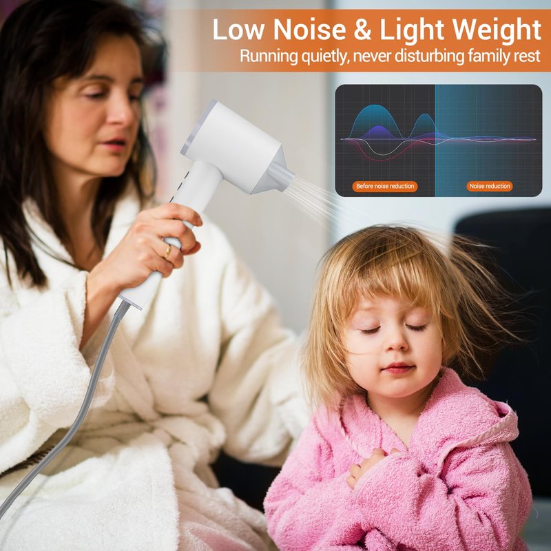 - Safe design: Adopted ALCI plug, no shock hazard. Air inlet is set in the head of a hair dryer, which avoids effecting air intake and sucking in hair. With reduce-noise design, hair dryers for women/men won't disturb family rest, free noise trouble.