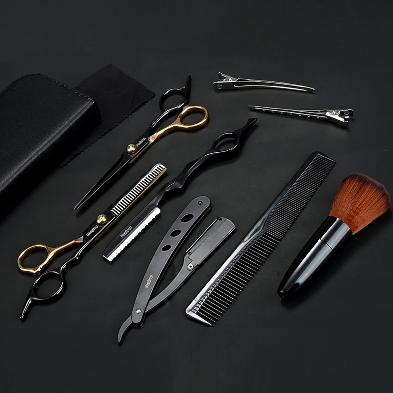 - ✂️ 🪒: ALL-IN-ONE HAIR CUTTING TOOLS: 1 x Hair Scissors,1 x Thinning Shear,1 x Hair Texturizing Cutting Razor, 1 x Straight Edge Razor (Blade Included), 1 x Cleaning Cloth, 1 x Comb, 2 x Hairpin, 1 x Neck Duster Brush, 1 x Leather Bag. The hair cutting kit meets all your hair cutting and styling needs.