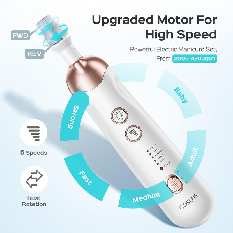 - Adjustable speeds and Direction for comfortable hand and foot daily care - 5 speed settings for 2,000 to 4,200 RPM nail drill machine. You can use low speed for delicate areas and high speed for smooth corns and calluses. With clockwise/counterclockwise rotation, you can easily adjust the speed and direction to suit your needs. The powerful motor ensures precise and efficient electric nail care kit, while the low noise level (<40dB) ensures a comfortable experience.