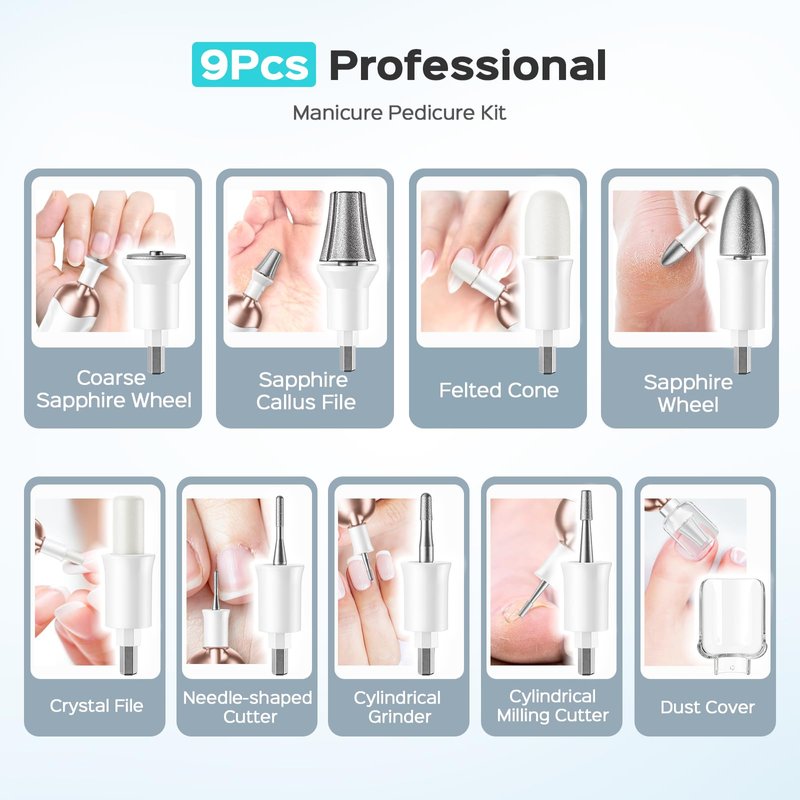 - We offer more nail drill parts to meet all your necessary hand and foot nail care needs: COSLUS adds 2 fine sanding heads for delicate hand and foot nail care and 1 felt sanding head for fingernails of safety polishing. 8 high-quality nail drill bits, Type-C charging cable, integrated LED light for electric precision nail file, and dust-proof lid keep your space clean and hygienic.