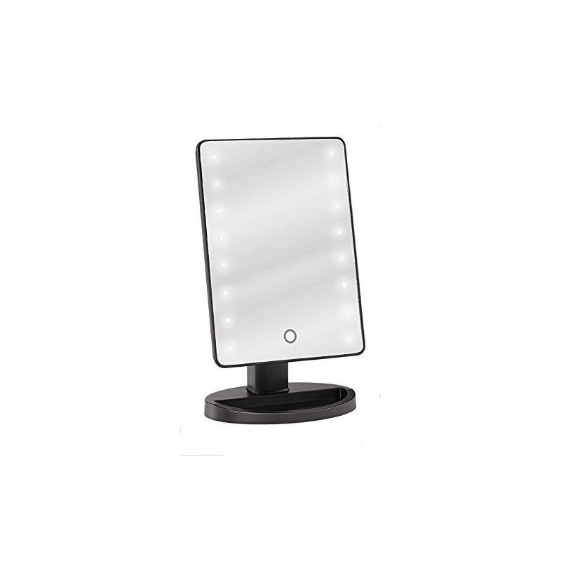 Our JUVITUS LED Tabletop Mirror is a standing portable wireless vanity mirror with smooth black finish. Full mirror and stand measurements are 6.5" x 11" making it ideal for your bathroom counter, dressing table or even traveling. The freestanding mirror is must have for makeup artists and aficionados. Adjustable tilt is perfect if you need the mirror to stand straight up and down or tilted to your preference. Accessory tray at base to hold a few lipsticks, balms, or small brushes (measures approx: 2.5" x 5.5"). Directions: To use: Power device on or off using the manual switch on the back. Turn the light on and off using the touch sensor on the front of the mirror. 4 AA Batteries Required (not included).